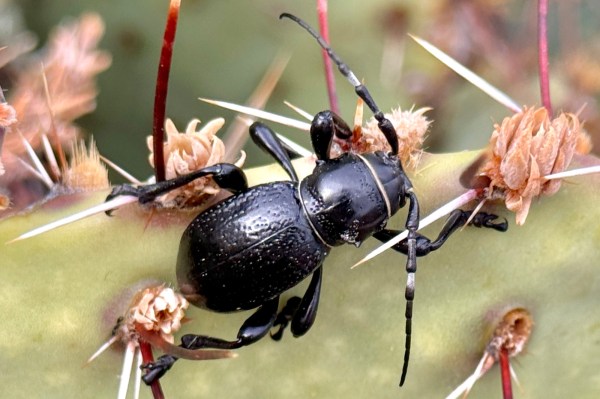 Moneilema armatum (black cactus longhorned beetle— family Cerambycidae) on Opuntia camanchica (tulip pricklypear cactus) in pinyon/oak/juniper woodland).