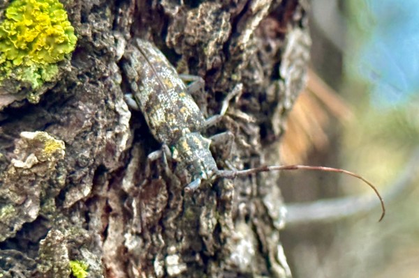 Monochamus clamator clamator (family Cerambycidae) on trunk of dead Pinus edulis (Colorado pinyon pine) in juniper/oak/pinyon woodland on sandstone escarpment. Two new state records on one tree (again!)?