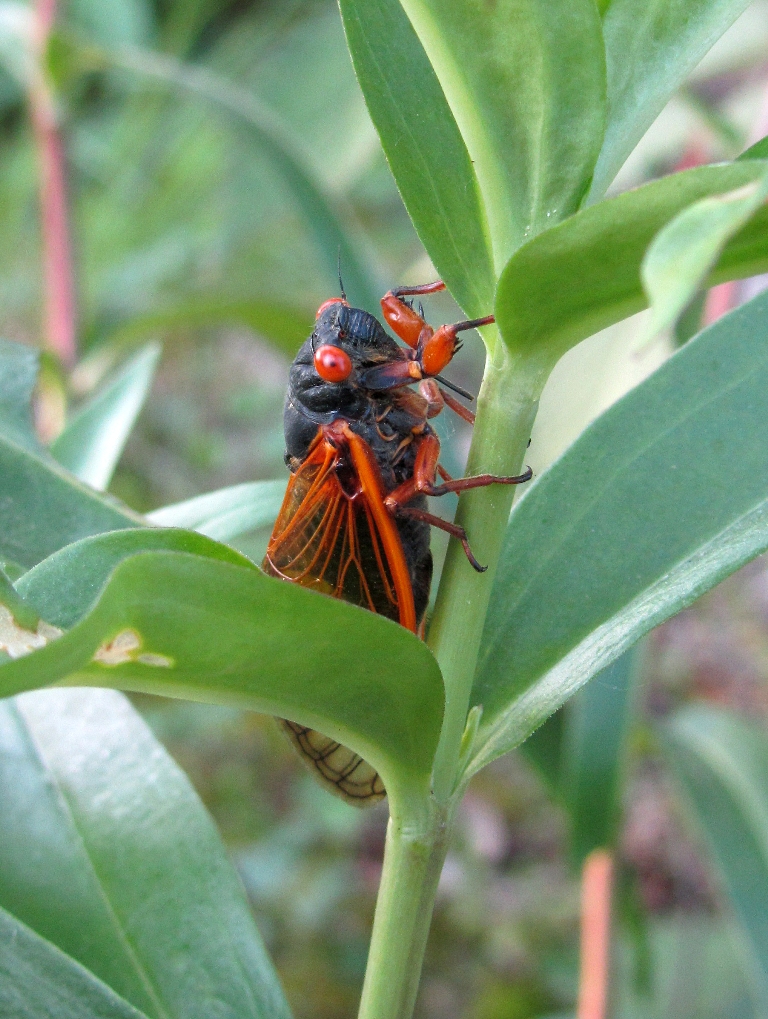 Consumed with sex, the adults don’t eat much, but occasionally one sees a cicada poking its proboscis into some soft plant tissue for a drink of sap (clearly exhibiting the relationship of these large insects to those smaller sap-feeders, the aphids and such). A little sap-drinking does little damage to plants, but the insertion of eggs by the mated females into small twigs of woody plants can do quite a bit of “natural pruning”. This would be more of a concern if it happened every year, I suppose, but it really also does little damage in the long run, especially on a mature tree. Still, I would have appreciated it they hadn’t found my recently planted black gum tree such an attractive oviposition site.