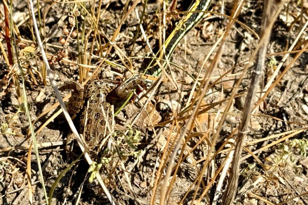 The timing seemed right, as patches of goldenrod (Solidago sp.) surrounding the reservoir were also just coming into bloom, but no adults were seen on either the stems of amorpha or the flowers of goldenrod. I did get to see a garter snake try (and fail) to catch a leopard frog. The snake had hold of the frog by one of its hind legs, but the frog used its other hind leg to eventually free himself while peeping desperately. I was kind of rooting for the frog, even though it would have been interesting to watch the snake as it ingested its prey.