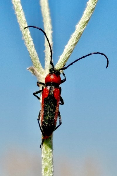 Crossidius discoideus (family Cerambycidae) on stem of Eriogonum annuum (annual buckwheat) in dry grassland.