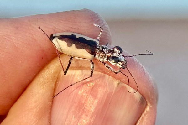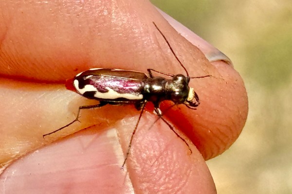 Cicindelidia obsoleta obsoleta (large grassland tiger beetle—family Cicindelidae) on sandy-loam 2-track through dry grassland.
