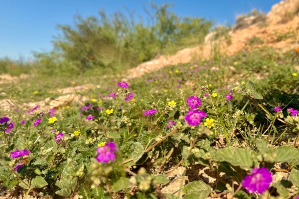 Allionia incarnata (trailing four o’clock—family Nyctaginaceae) on slope below gypsum/red siltstone escarpment.