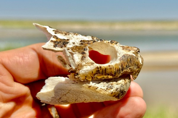 Common snapping turtle (Chelydra serpentina) skull along alkaline lake margin.
