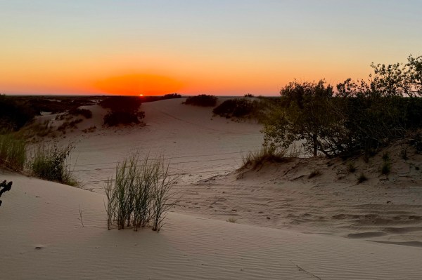 Mescalero Sands Recreation Area Chaves County, New Mexico There are two species of Prionus longhorned beetles endemic to the sand dunes of southeastern New Mexico and western Texas—P. arenarius, which occurs during spring and early summer, and P. spinipennis, which occurs during late summer and fall. I’ve collected the former twice—once several years ago here at this very spot, and again this year at Oasis State Park back in June. I’ve never collected P. spinipennis, however, and figured they should be out by now. I had brought with me a few prionic acid lures, to which the males are attracted (prionic acid is a main component of the pheromones that females of all Prionus species release to call mates), and I also hoped to find and photograph the sand dune subspecies of Cicindela formosa—i.e., C. f. rutilovirescens (which I found yesterday near Portales but did not photograph). Unfortunately, my arrival just 20 minutes before sunset precluded the latter possibility, so instead I hiked into the dunes a short distance to place the pheromone lures and enjoyed a spectacular sunset and moonrise, with the sky morphing from blue to orange before finally turning black.
