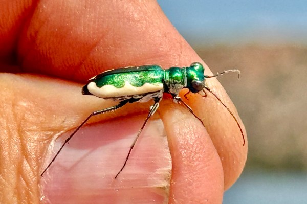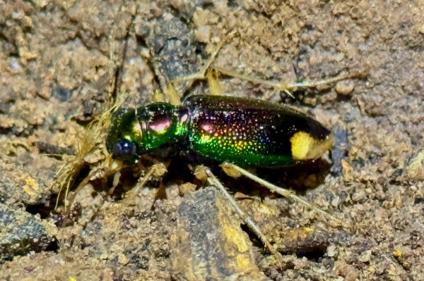 Cicindelidia punctulata (punctured tiger beetle—family Cicindelidae) on clay exposure in juniper chaparral. The greenish cast suggests the population in this area represents an integrade between the nominotypical eastern subspecies and the western C. p. chihuahuae.