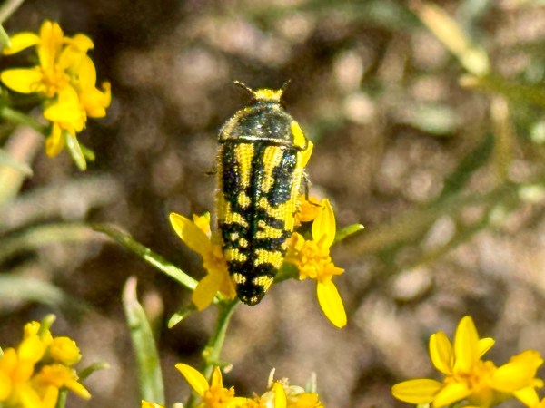 While I was checking the traps, I kept an eye out for tiger beetles and flower-visiting longhorns and buprestids. I did see one Acmaeodera rubronotata on flowers of Gutierrezia sarothroides (broom snakeweed), but this was the only one despite looking at many flowers and I chose not to linger.