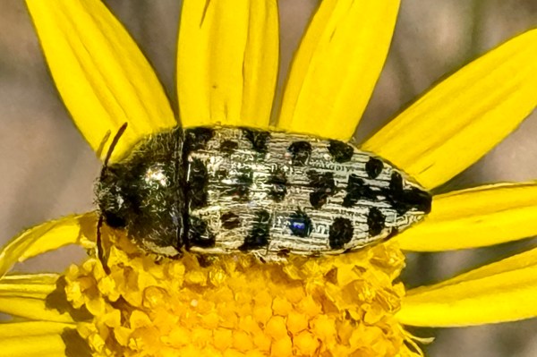 The locality where E. t. globicollis had been recorded was on the far west side of the lake, so I walked the lake margin in that direction while checking the saltbush and goldenbush along the way. It was quite a while before I found another C. suturalis on I. pluriflora, and on another plant very nearby I found a nice little cetoniine scarab: Euphoria pilipennis—a species I’ve never collected before.