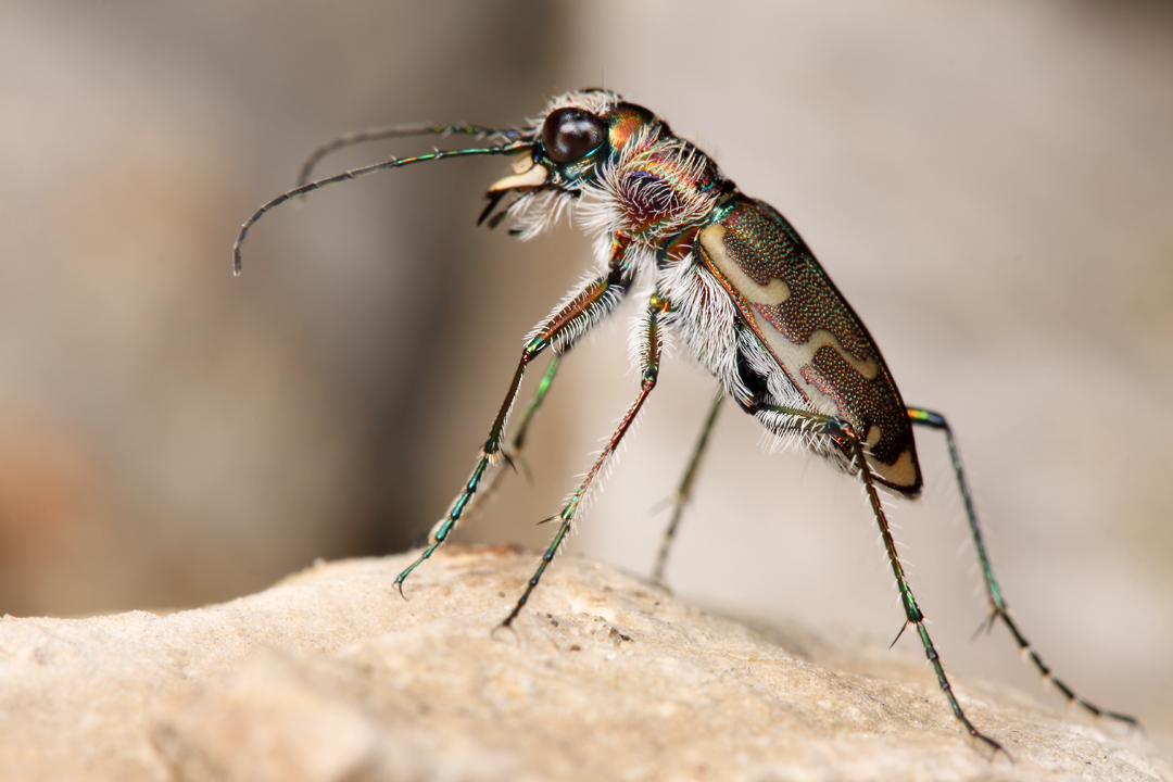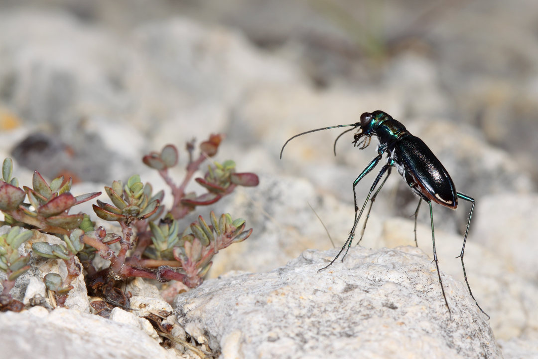 As we continued past the hilltop prairie, several individuals of Sideroxylon lanuginosum (gum bumelia or woolly buckthorn) were found along the dry ridgetop trail. Whenever I see S. lanuginosum, I look for signs of Plinthocoelium suaveolens (bumelia borer)—arguably North America’s most beautiful longhorned beetle. No signs were seen at the first tree, but at the second the telltale frass (digested sawdust ejected by the larvae that bore through the main roots of living trees) was easily spotted at the base of the trunk. This beetle is distributed across the southeastern and south-central U.S. wherever it’s host can be found, occurring reliably as far north as the dolomite glades south of St. Louis; however, I am unaware of any records of this beetle from Illinois.