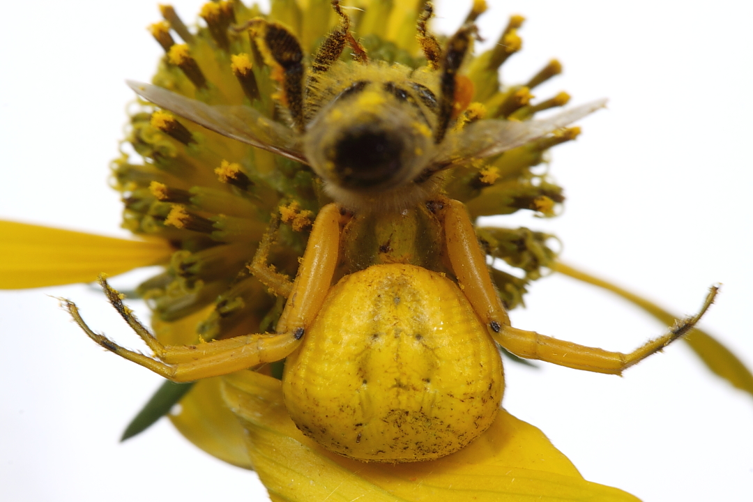 I think I’ll close with this minimally processed photograph of what I take to be Misumenoides formosipes (whitebanded crab spider) and its honey bee (Apis mellifera) prey. Although I photographed this spider using flash and looking straight up into an overcast sky, I managed to properly illuminate the subject and avoid blown yellows and an all-black background by using some of the very techniques and principles that I had just learned earlier that day. I hope to learn more at BugShot 2012!