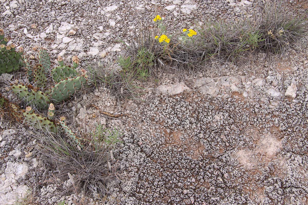 Photo 7 - Cylindera celeripes microhabitat at Alabaster Caverns State Park. Note thick encrustation of lichens on clay substrate amidst white gypsum exposures.