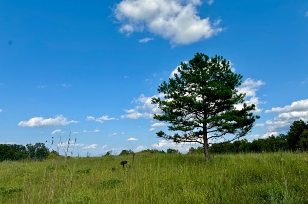 A lone Pinus echinata (shortleaf pine) in restored tallgrass prairie remnant.