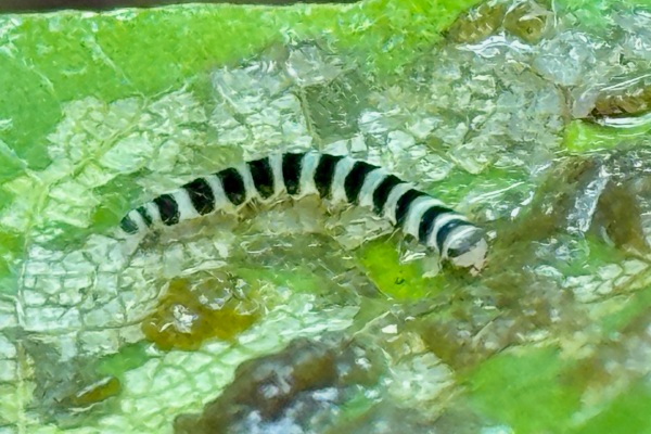 Halysidota tessellaris (banded tussock moth—family Erebidae) on foliage of Carya tomentosa (mockernut hickory) in restored tallgrass prairie remnant.
