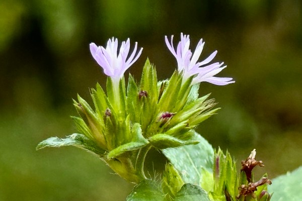 Symphyotrichum patens (late purple aster) was the first true aster that we noticed, a rather common species distinguished by its purple (of course) flowers with loose but not recurved phyllaries and leaves broadly clasping the stem. It wasn’t long before we had a chance to test our knowledge when we encountered the similar appearing Symphyotrichum anomalum (manyray aster), also with purple flowers but distinguished from S. patens by its distinctly recurved phyllaries and petiolate rather than clasping leaves. Eventually, we would encounter a third species of the genus—Symphyotrichum lateriflorum (calico aster), distinguished by its numerous small white flowers at the tips of numerous lateral branches rather than the terminus of the stem.
