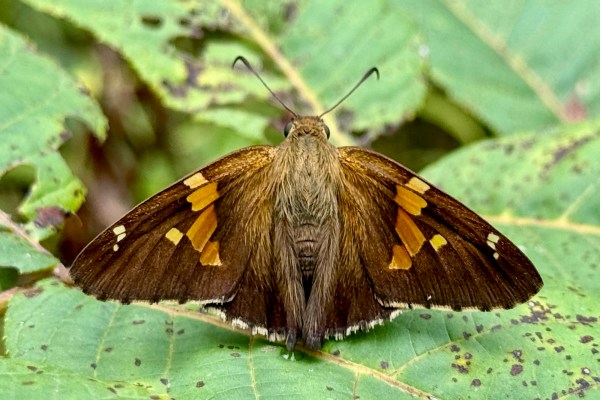 Epargyreus clarus (silver-spotted skipper—family Hesperiidae) perched on Solidago altissima (tall goldenrod).