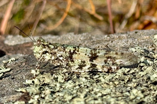 Trimerotropis saxatilis (lichen grasshopper) on lichen-covered rhyolite exposures in xeric igneous prairie.