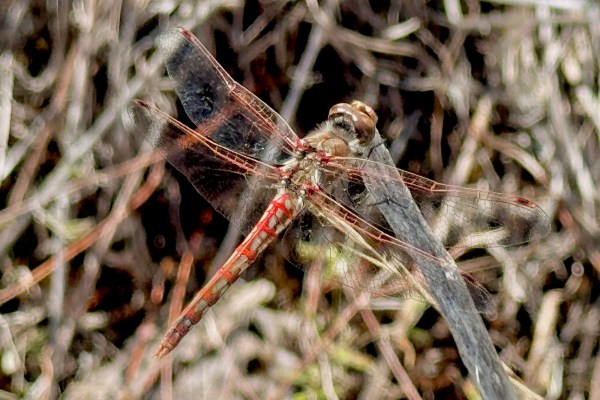 The group fanned out across the glades as they worked their way up towards the summit. Of special interest were flowers that might host pollinating insects (and possibly even T. coquus). Few flowers would be found, however—a consequence of abnormally dry conditions since late July, and we found ourselves looking for other targets. Ted managed to photograph a beautiful red-marked variegated meadowhawk dragonfly (Sympetrum corruptum), while David “captured” (through the viewfinder) a male black swallowtail butterfly (Papilio polyxenes).