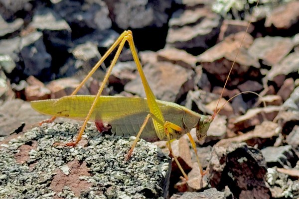 Along the way, the lichen grasshoppers continued to attract our attention due to their abundance and striking diversity of coloration. We were treated to a particularly obvious example of this when we encountered a mating pair with the much smaller male exhibiting shades of brown instead of the greens exhibited by the much larger female.