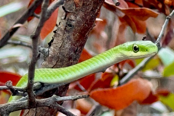 Spider and fly photographs in hand, Ted and Chris resumed their descent but took only a few steps before another sighting demanded photographs—a rough green tree snake (Opheodrys aestivus) peering quizzically from amongst the rust-red leaves of a stunted blackjack oak. The snake cooperated at first, allowing a few closeup photographs before making a run for it. Fortunately, this is a very docile species that rarely (if ever) bites when handled, so Chris and Ted were able to corral it for additional photos before returning it back to the tree from whence it came.