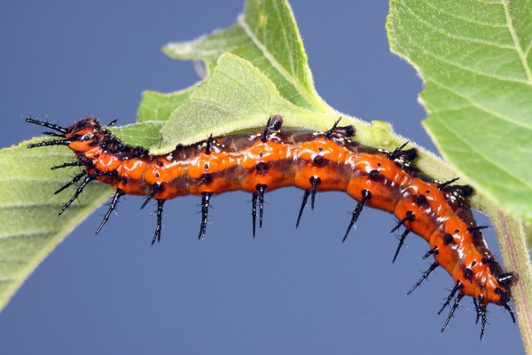 I’m not sure, but I think this might be the first time I’ve photographed a butterfly caterpillar. Not a bad subject to start with, as few butterflies have caterpillars that are more colorful than the Gulf Fritillary, Agraulis vanillae. A common resident in the southern states and further south, this member of the nymphalid subfamily Heliconiinae is less commonly encountered in Missouri—in fact, I had never seen (or at least noticed) these caterpillars before encountering a few feeding hungrily on the foliage of maypop (Passiflora incarnata) growing in a city park in Missouri’s southeastern lowlands. While the stunning colors of these caterpillars are a delight to human eyes, their function, as in most butterfly caterpillars, is to advertise the unpalatability of their toxin-laced bodies. In the case of this species, the toxins include cyanogenic glycosides that the larvae sequester from the tissues of their host plants (ironically these compounds are supposed to serve the same protective function for the plant that produces them, but butterflies have become master specialists at evolving mechanisms to sidestep toxic impacts).