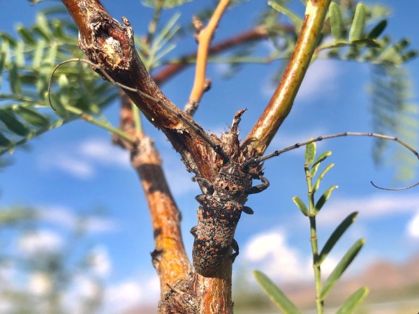 As I worked I was approached by several tourists curious about what I was doing. I cheerfully fielded their questions and even showed the specimens to those interested, having long ago stopped seeing these as annoying interruptions but rather opportunities to present the science of entomology in a favorable light. I did not extend the same courtesy to a particular Arizona Republican, who pulled up in his large pickup (white, with giant tires of course) and got out packing an intentionally visible sidearm. I’m thinking “Who in the hell does this man think he’ll meet that he needs to be able to shoot them?” That’s some compensation if I ever saw it! I hoped he wouldn’t want to engage, but no such luck—when he asked me what I was doing, I just said “kinda busy” in an attempt to abort any further interaction. This worked, and I was relieved to not have to tell him more directly not to approach me. I worked several other dead pinyon pines in the area the same way but was not able to replicate the success I’d had at that first tree, so I began beating the living trees in the area to see if adults of other woodboring species were out and about. Indeed they were, producing several individuals of one of a sculptured Chrysobothris sp., a small species of Acanthocinini, and a giant male Monochamus clamator.