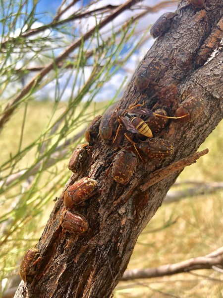 Our original plan after arriving yesterday had been to see how collecting was in the area and then make a decision whether to remain (if the collecting was good) or travel further east into the Texas panhandle) to one of several state parks that had caught my interest. The collecting we experienced yesterday—obviously—warranted continued collecting for at least another day, so rather than tearing down camp to get back on the road we were able to leisurely enjoy our morning coffee before striking out. My first target was the dead P. edulis right in our campsite that had produced so many interesting insects yesterday. Inspection of its trunk and branches revealed more of the cicadas (Hadoa duryi) that were abundant in the area, a few of which I collected, and beating its branches produced yet another series of E. neomexicanus.