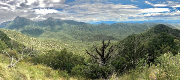 After climbing back up on the other side we reached pinyon/juniper woodland, and it became increasingly impossible for me to resist stopping every time I saw a pinyon pine with light green to brown needles—meaning the tree was dying or had recently died and was, thus, ripe for infestation by woodboring beetles!