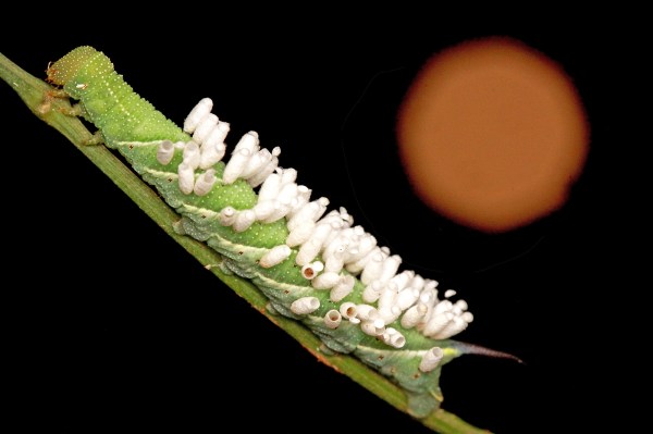 A tobacco hornworm (Manduca sexta) caterpillar that has been parasitized by braconid wasps (Cotesia sp.). The wasps developed inside the caterpillar as grubs, consuming all but the most vital of organs to avoid killing it before they completed their development. They then exited the caterpillar’s body and spun small white silken cocoons in which to pupate and eventually emerge as adults. The adult wasps have already emerged, and though the caterpillar is still alive, it will die before it can complete its development and become an adult moth. The caterpillar was photographed at night in front of a so-called “supermoon” rising in the eastern sky. This is a single exposure image—-not a composite photograph—with the camera focused on the caterpillar (illuminated by flash) but its settings adjusted to also detect ambient light from the distant moon. The moon is necessarily out of focus due to depth-of-field constraints. Photographed 11 Aug 2014 in Mississippi Co., Missouri at the Hwy 62 bridge over the Mississippi River.