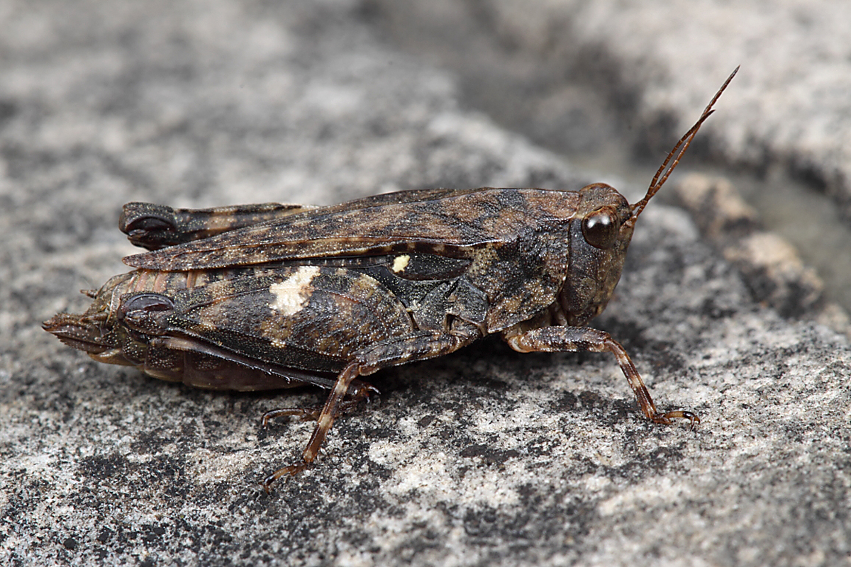 Not long ago, I got an email from grasshopper expert David J. Ferguson confirming my identification of Pardalophora phoenicoptera (and also encouraging my recent fascination with band-winged grasshoppers (family Acrididae, subfamily Oedepodinae) and their marvelously cryptic nymphs). He suggested that I might also find the “toad lubbers” (family Romaleidae) and pygmy grasshoppers (family Tetrigidae) interesting, since they too have many of those qualities I was finding attractive in band-winged nymphs, only on a very small scale. It was a prescient comment, as I’d already started taking notice of the pygmies and even photographed one before ever getting his email.