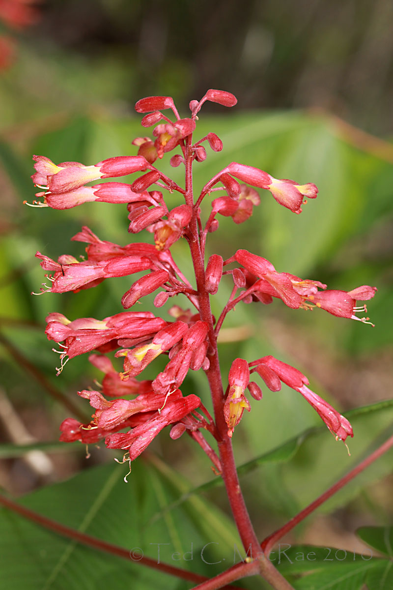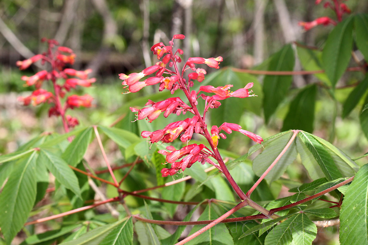 Red buckeye is native to the southeastern U.S., just reaching Missouri in the southeastern Ozarks (though cultivated further north). This makes it less well-known than the more widely distributed Ohio buckeye, Aesculus glabra (absent only from the southeastern lowlands and northwestern corner of the state, and easily distinguished by its white inflorescences, larger size, and spreading growth habit). Like that species, the seeds and young foliage especially are poisonous if eaten due to glycosidic alkaloids and saponins. Native Americans roasted, peeled and mashed the nuts into a meal called “Hetuck.”