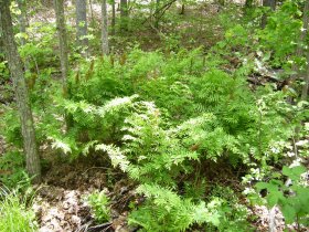 attaching to the roots of their hosts by means of their long, thin rhizomes. Resuming our hike, we descended down into a shaded, moist draw feeding the lake and saw a huge royal fern (Osmunda regalis var. spectabilis) bush. I had never seen this aptly named fern before, but it was immediately recognizeable by its large size (~5 ft in height) and presence of distinctive, fertile leaflets on some of its upper branches – a very striking and handsome fern, indeed. Nearby was a smaller, but no less attractive species of fern that I take to be marginal sheild fern (Dryopteris marginalis) – another species I have not seen before (or at least made the effort to notice).