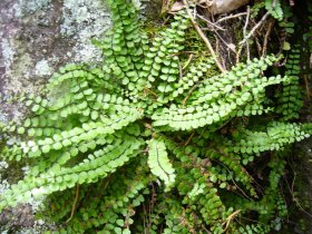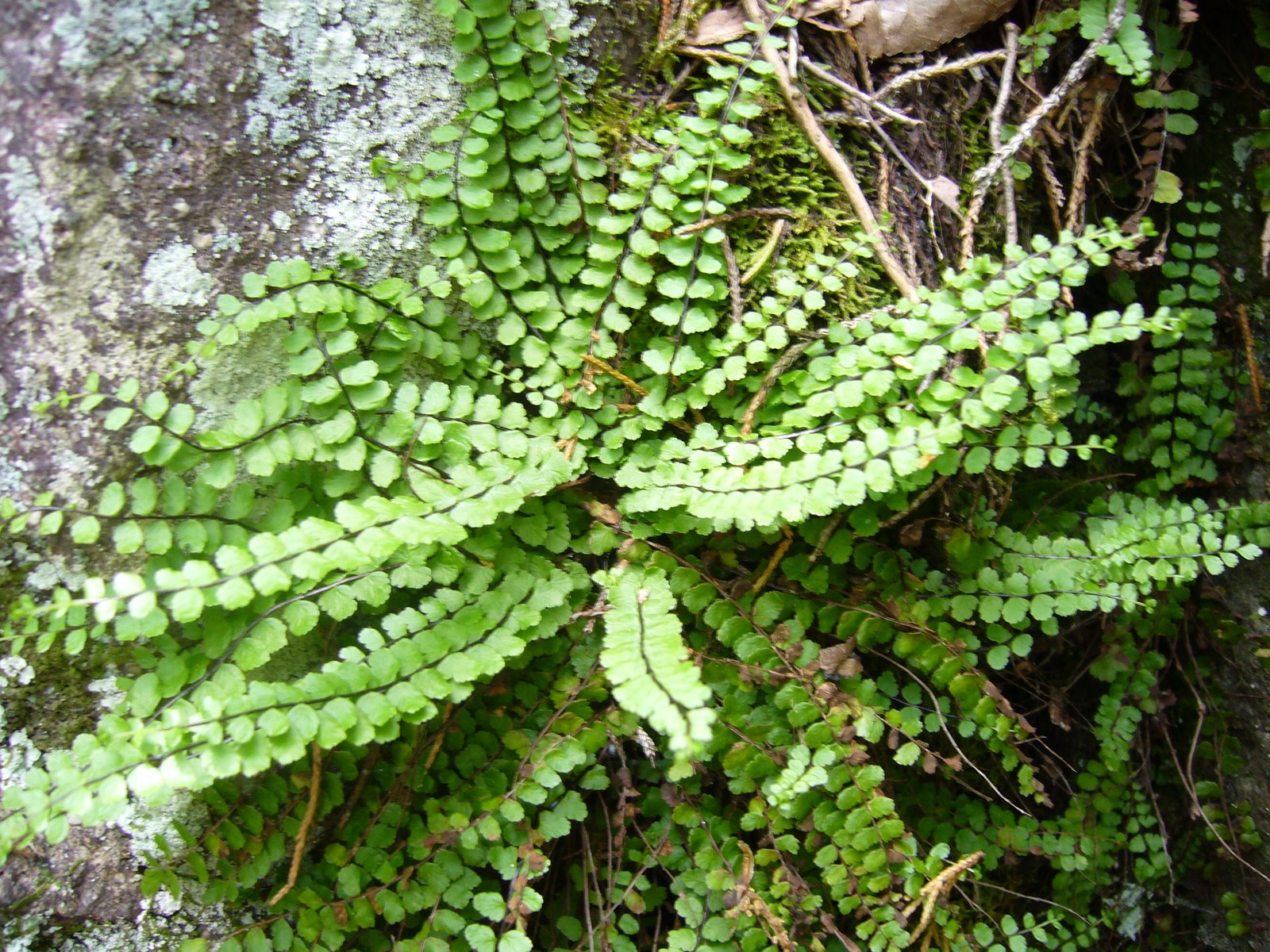 Soon, we reached the dam and for the first time saw the spectacular rhyolite shut-ins. While perhaps not quite as impressive as the nearby and much more famous Johnson’s Shut-Ins, Rich and I nonetheless watched entranced as the water roared over the smooth igneous rock exposure, forming elegant cascades, rushing through narrow chutes, and swirling into small pools. Steep canyon walls rose sharply on each side of the shut-ins, as if standing guard. Clambering amidst the pines and cedars that cloaked them, we found this maidenhair spleenwort (Asplenium trichomanes) nestled within a crack on a vertical rock face under continuous deep shade.