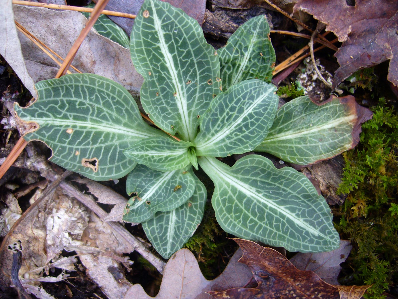 …while this rattlesnake plantain orchid (Goodyera pubescens) was seen in a colony growing at the base of a black oak tree (Quercus velutina) just above the creek.