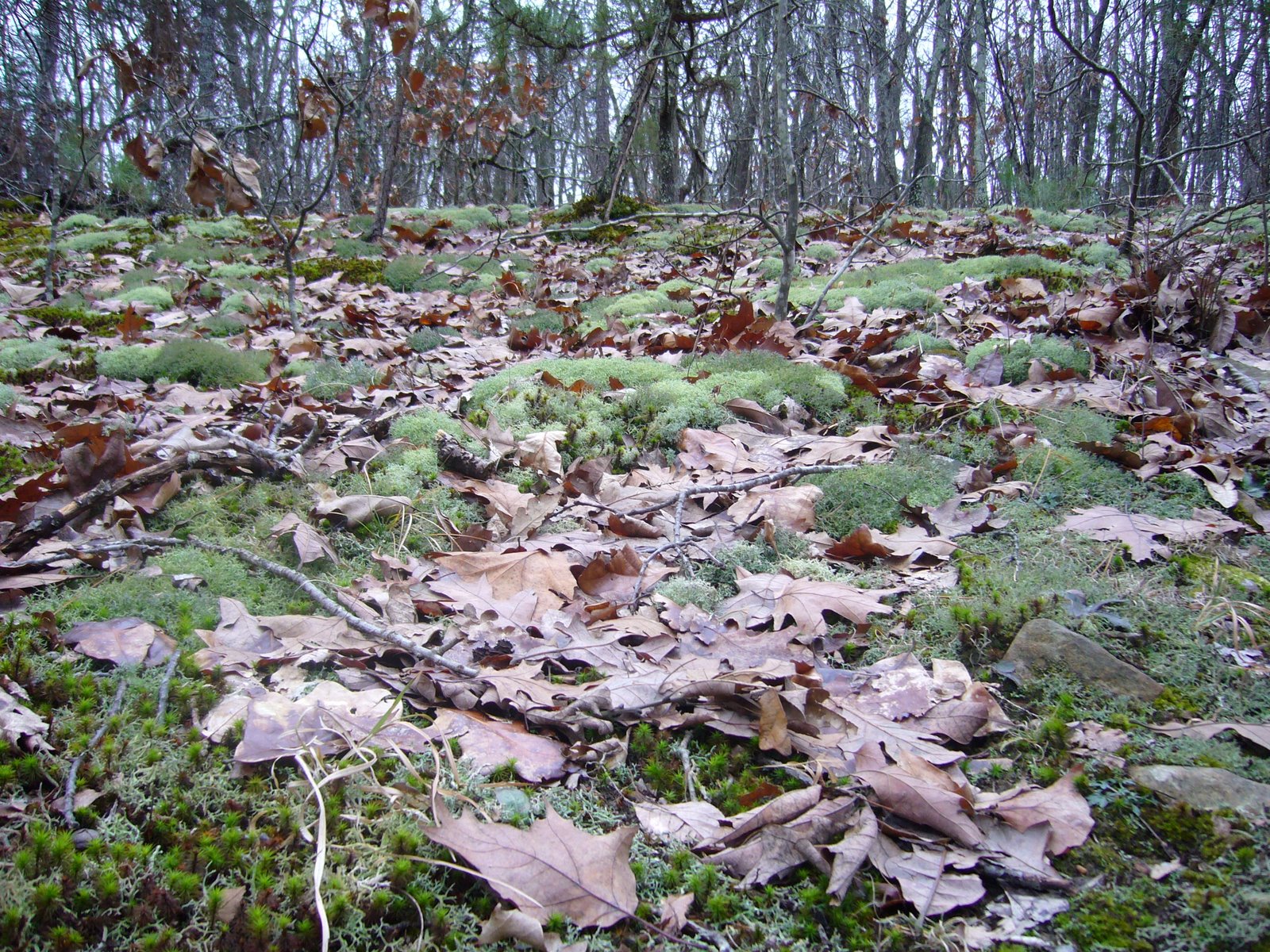 Near the end of the loop lies Piney Glade, an area where the exposed sandstone bedrock once again creates a dry, harsh environment. Poverty grass and little bluestem grow in small, shallow pockets of soil scattered amongst stunted shortleaf pines and blackjack oaks – creating a small prairie surrounded by a sea of forest. All three forms of lichens can be found on the rocks and soils of the glade – the aptly named crustose lichens cling tightly to rock surfaces amongst foliose (leafy) and fruticose (branched) lichens.