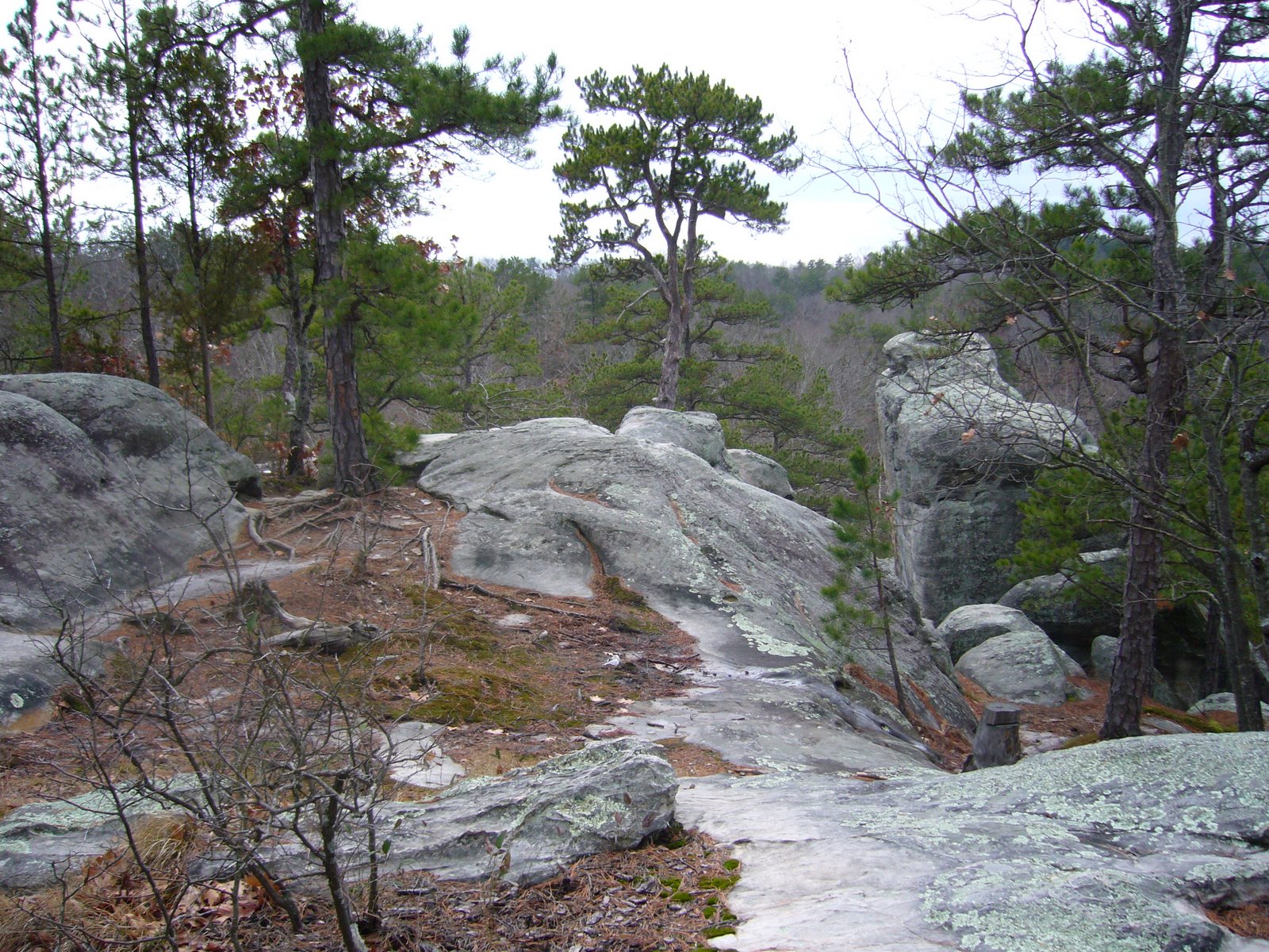 Dome Rock Overlook is a the largest hoodoo complex in the Natural Area. The thin soils and exposed conditions create a harsh, dry, windswept environment that only the hardiest of plants can withstand. Only a few small blackjack oaks (Quercus marilandica), shortleaf pines (Pinus echinata), and farkleberry (Vaccinium arboreum) survive here. Despite their small size, some of the trees growing here are at least 150 years old.