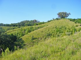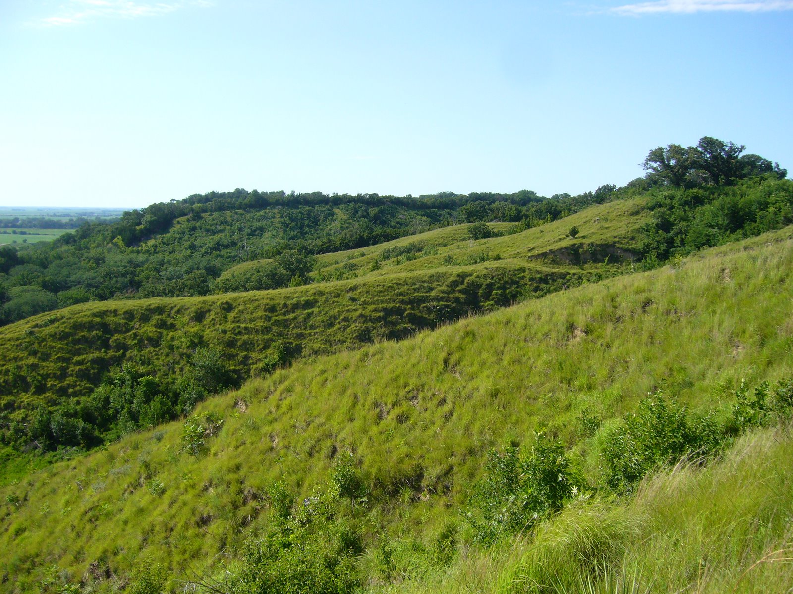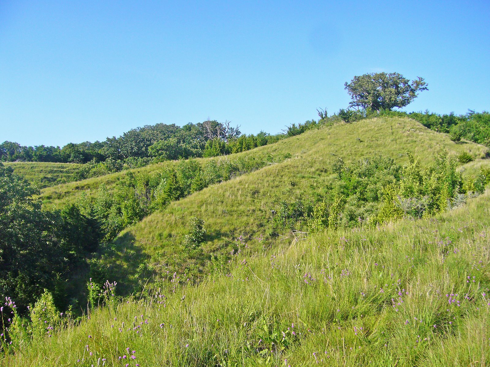 Last month I talked about the critically imperiled sand prairie community in extreme southeast Missouri. This month, we travel 500 miles to the distant northwestern corner of the state to visit another critically imperiled community – the dry loess prairie. These communities are confined to thin slivers of bluff top along the Missouri River in Atchison and Holt Counties. The bluffs on which they lie are themselves part of a unique landform called the Loess Hills. Like the sand prairies of the southeastern lowlands, this angular landscape owes its birth to the glacial advances of the Pleistocene epoch (2.5 million to 10,000 years ago), when streams of meltwater – swollen and heavily laden with finely ground sediments (i.e., glacial “flour”) – filled river valleys throughout the Midwest during Pleistocene summers. Brutal cold during winter reduced these flows to a trickle, allowing the prevailing westerly winds to pick up the sediments, left high and dry, and drop them on leeward upland surfaces across Iowa and northern Missouri. The thickest deposits occurred along the abrupt eastern border of the Missouri River valley – at least 60 feet deep, and in places up to 200 feet. Loess (pronounced “luss”) is a homogeneous, fine-grained, quartz silt – undisturbed it is highly cohesive and able to stand in near vertical bluffs. It is also extremely prone to erosion, and as a result for 10,000 years now the forces of water have reshaped the Loess Hills into the landform we see today. Loess itself is not rare – thick deposits can be found in many parts of the world and over thousands of square miles across the Midwest. It is here, however, along the western edge of Iowa and northern Missouri – and nowhere else in North America – where loess deposits are deep enough and extensive enough to obliterate any influence by the underlying bedrock and dictate the form of the landscape.