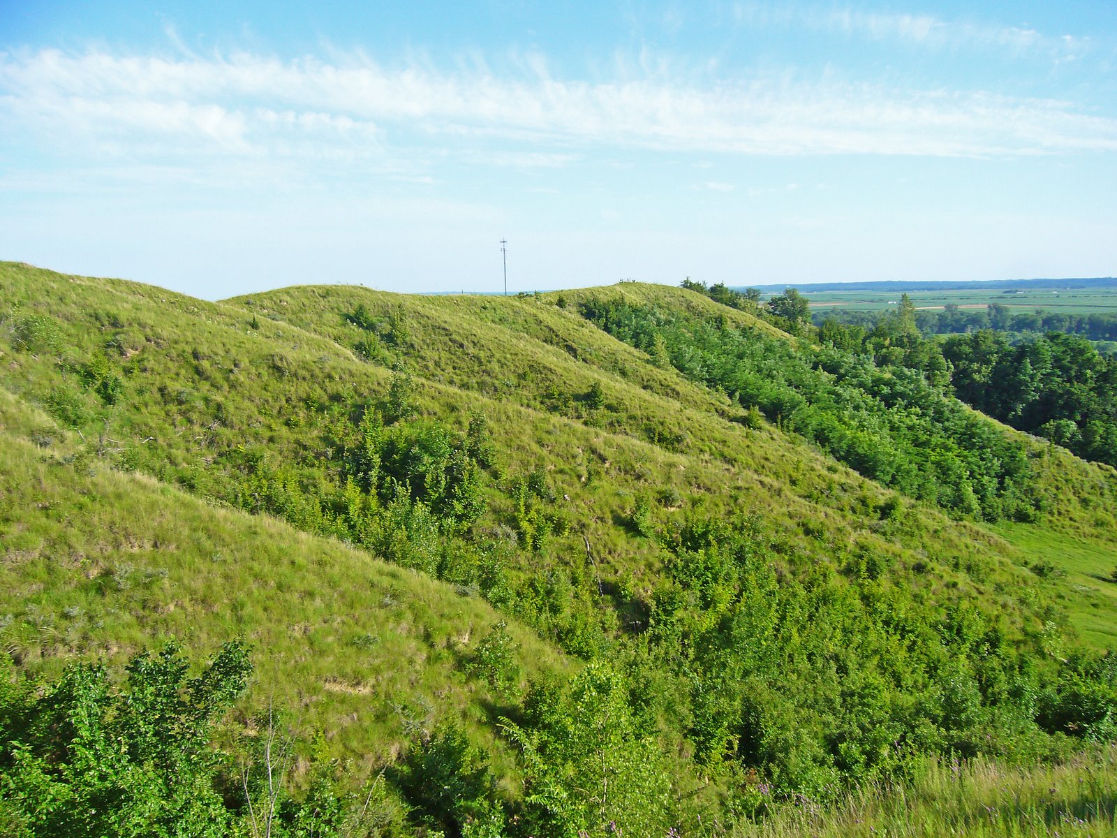 It is this form that makes the Loess Hills so unique. The depth of the soil, its cohesiveness, its natural tendency to slump on steep slopes and sheer in vertical planes, and the action of water over the past several millenia have created a landscape of narrow undulating ridges flanked by steep slopes and numerous side spurs, intricate drainages with sharply cut gullies, and long, narrow terraces called “catsteps” cutting across the steep upper hillsides. It’s a sharp, angular, corrugated landscape, stretching 200 miles north and south in a narrow band of varying width from north of Souix City, Iowa, to its southern terminus in northwestern Missouri. Its western boundary is sharply delimited by the Missouri River valley, where lateral erosion (now halted by channelization of the river) and vertical sheering have created precipitous bluff faces. The eastern boundary is harder to delimit and is dependent upon the thickness of the loess. Deposits that fall below 60 feet in depth are unable to mask and reshape the rolling terrain of the eroded glacial till lying beneath. In general, this happens at distances of only 3 to 10 miles from the western edge of the landform.