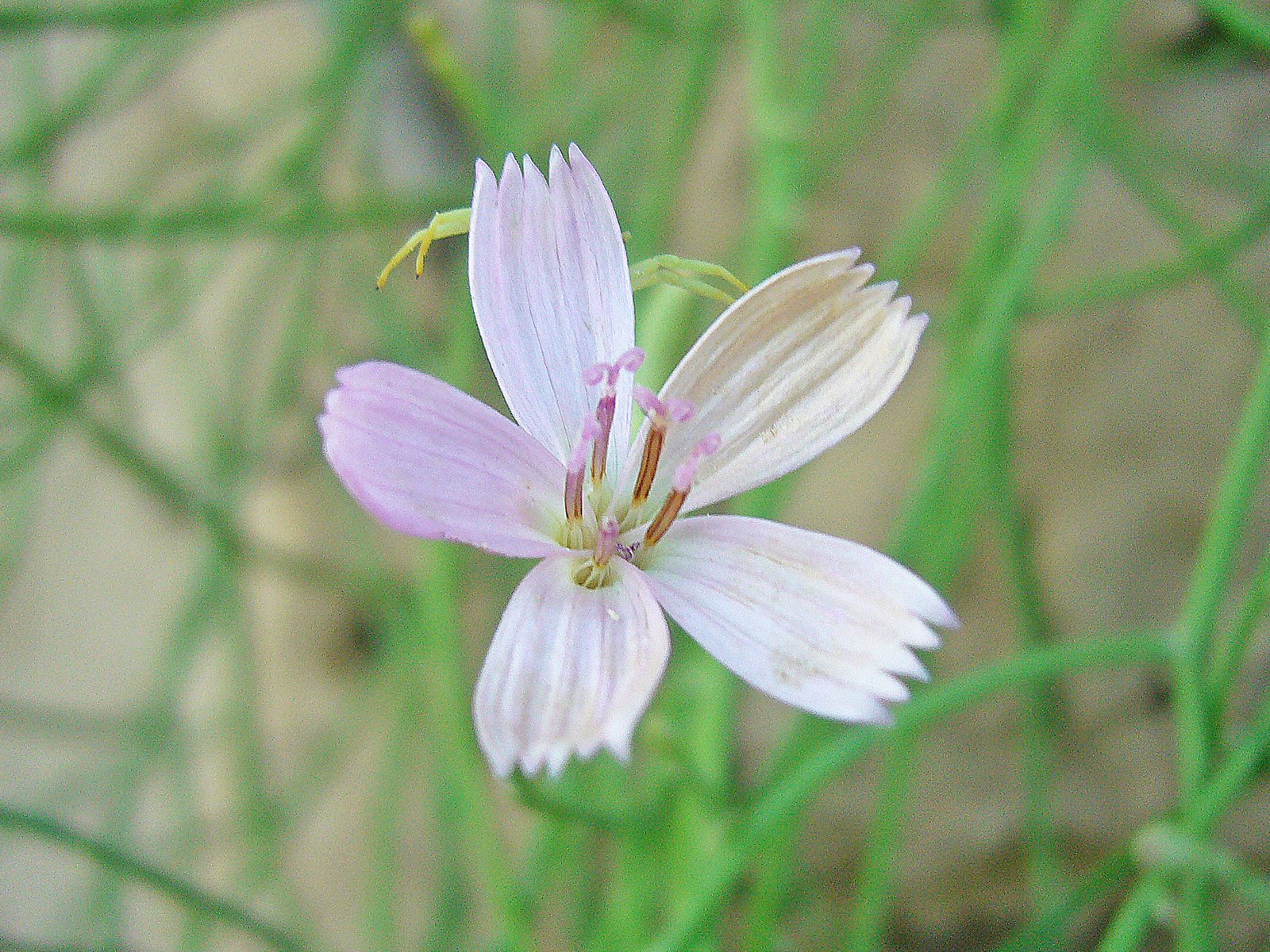 Its southern terminus in Missouri, however, is the most arbitrary boundary. Discontinuous patches of deep loess terrain do occur as far south as Kansas City, but the dry hilltop prairies, common in the north, are gradually replaced by woodland in the south and disappear completely just north of St. Joseph. It is this interdigitation of two great biomes – the great deciduous forest to the east, and the expansive grasslands stretching far to the west – that give the Loess Hills such a fascinating natural history. This is due as much to the physical character of the Loess Hills themselves as to their ecotonal position at the center of the continent. Rapid drainage of rainwater off the steep slopes combines with direct sun and prevailing southwesterly summer winds to create very dry conditions on hilltops and south and west facing slopes, especially on the steeper slopes along the landform’s western edge. Such xeric conditions favor the growth of more drought-tolerant species derived from the western grasslands. North and east facing slopes and valley floors, protected from direct sun and drying winds, are able to retain more moisture, favoring the growth of woody plant species more common in the eastern forests. Seasonal moisture also shows a north-south gradient, with southern latitudes receiving higher annual rainfall totals that also favors the growth of woody plants, while the lower rainfall totals further north result in larger, more expansive grassland habitats. The steep slopes and rapid drainage create much more xeric conditions than those found further south in the flat to rolling terrain of the unglaciated Osage Plain, resulting in a more drought-tolerant mixed-grass prairie rather than the tallgrass prairie of western and southwestern Missouri. The distribution patterns of prairie versus woodland are dynamic and ever-changing, influenced by both natural and anthropogenic processes. Climatic conditions over much of the Loess Hills are capable of supporting either community type, both of which repeatedly expand and shrink as the balance tips in favor of one versus the other. In the past, the major influence was shifting periods of greater or lesser rainfall. During drier periods, grasslands expanded and woodlands shrank, finding refuge in only the moistest streamside habitats. Wetter periods allowed woody plants to migrate out of the valleys and up the slopes, especially those facing north and east. One particular very dry “hypsithermal” began about 9,000 years ago and lasted for several thousand years. Tallgrass prairies expanded as far east as present day Ohio, and todays tallgrass praires in the eastern Great Plains were invaded by even more drought-tolerant species from the shortgrass prairies further west. Eventually the hypsithermal abated, moisture levels increased, and the grasslands retreated in the face of the advanding forest. Not all of the drought-tolerant species were driven back, however, and scattered populations of these “hypsithermal relicts” still remain on locally dry sites far to the east of their normal range of distribution. Conspicuous examples of such in Missouri’s Loess Hills are soapweed yucca (Yucca glauca var. glauca) and the leafless-appearing skeletonweed (Lygodesmia juncea) (plant above, flower right). Both of these plants are normally found further west in the mixed grass prairies of the western Great Plains but are considered endangered in Missouri due to the great rarity of the dry loess prairies on which their survival depends. (Incidentally, note the crab spider legs extending from behind the petals of the skeletonweed flower). In total, more than a dozen plant species occurring in Missouri’s dry loess prairies are listed as species of conservation concern, along with one reptile (Great Plains skink) and one mammal (Plains pocket mouse).