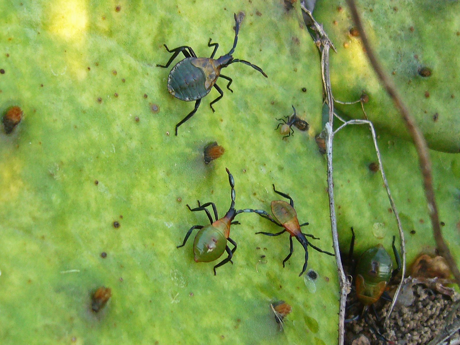 Chelinidea vittigerPrickly pear cactus (Opuntia humifusa) grows abundantly in the sandy soil amongst the clumps of bluestem, and on the pads were these nymphs of Chelinidea vittiger (cactus bug, family Coreidae). This wide-ranging species occurs across the U.S. and southward to northern Mexico wherever prickly pear hosts can be found. This species can either be considered a beneficial or a pest, depending upon perspective. On the one hand, it serves as a minor component in a pest complex that prevents prickly pear from aggressively overtaking rangelands in North America; however, prickly pear is used by ranchers as emergency forage, and fruits and spineless pads are also sometimes harvested for produce. In Missouri, O. humifusa is a non-aggressive component of glades, prairies, and sand and gravel washes, making C. vittiger an interesting member of the states natural diversity.