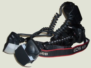 Twin flash heads are held by dual arm flash bracket and covered with DIY diffusers.