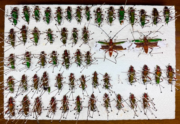 In the end, around 15–20 brace pins will be needed for each specimen (twice that if the antennae and wings are posed outstretched). It generally takes up to a week for the specimens to dry sufficiently. Note: resist the temptation to remove the pins too soon, as even though the legs and antennae may appear to hold position, they will still gradually sag out of position if they are not completely dry (for those of you who are in a hurry, low heat from an incandescent bulb positioned immediately above the specimens can help speed the drying process!).