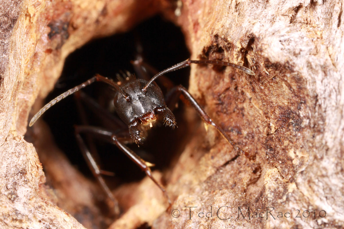 I recently came across this ant in the southeastern Missouri Ozarks sitting in a hole in the trunk of a standing dead black oak (Quercus velutinus) tree, apparently guarding the entrance to its nest. This big black ant is frequently associated with dead wood; however, this is the first time I’ve noticed one guarding the entrance to its nest. Other workers coming back to the nest were greeted by this individual by a quick rubbing of antennae and then allowed to pass. The close approach of my camera apparently was not very welcome by the ant, who responded by showing off his *her* impressive choppers.