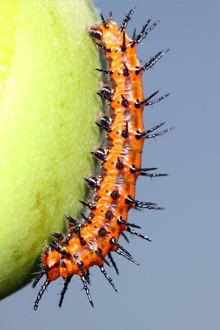I’m not sure, but I think this might be the first time I’ve photographed a butterfly caterpillar. Not a bad subject to start with, as few butterflies have caterpillars that are more colorful than the Gulf Fritillary, Agraulis vanillae. A common resident in the southern states and further south, this member of the nymphalid subfamily Heliconiinae is less commonly encountered in Missouri—in fact, I had never seen (or at least noticed) these caterpillars before encountering a few feeding hungrily on the foliage of maypop (Passiflora incarnata) growing in a city park in Missouri’s southeastern lowlands. While the stunning colors of these caterpillars are a delight to human eyes, their function, as in most butterfly caterpillars, is to advertise the unpalatability of their toxin-laced bodies. In the case of this species, the toxins include cyanogenic glycosides that the larvae sequester from the tissues of their host plants (ironically these compounds are supposed to serve the same protective function for the plant that produces them, but butterflies have become master specialists at evolving mechanisms to sidestep toxic impacts).