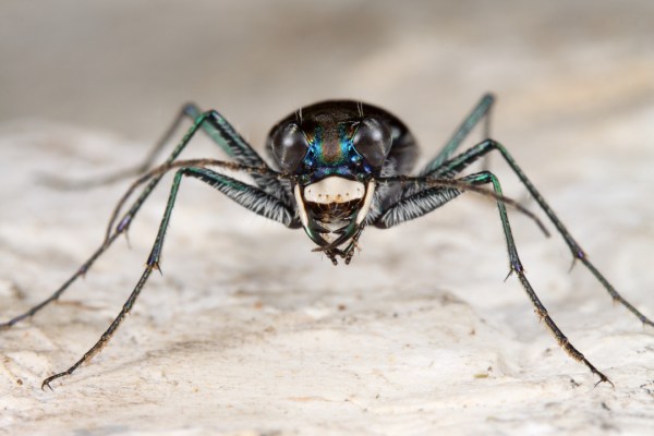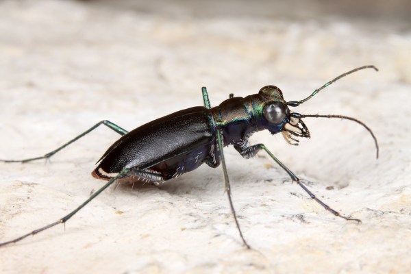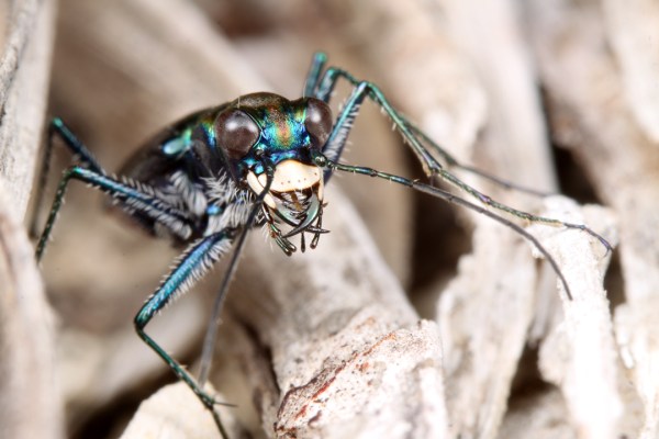 After getting several good photos of the beetle in its habitat, I decided it was time to try for some really close photos and added a full set of extension tubes to the camera. A set of tubes with a 100mm macro lens provides close to 2X magnification, but it also reduces the available working distance—a real challenge with wary tiger beetles under a midday sun! I spent quite a bit of time trying to get close enough to take advantage of the additional magnification, but I wasn’t successful until I encountered the individual in the photos below shade-seeking at the base of a yucca plant. Shade-seeking beetles tend to stay put and not move as much (although they still rarely just sit there).