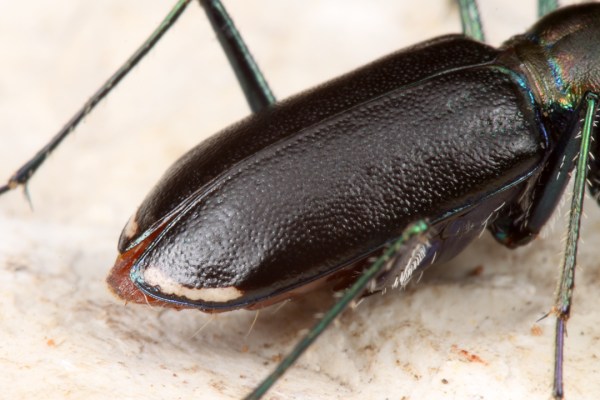 At this point I had a decision to make—if I drove to the next locality on my list (2-hour drive), I probably would not arrive with enough time before sunset to find beetles. I decided not to waste the remaining daylight and instead just bushwhack where I was to look for similar roadside habitats and drive on after sunset. I found another good habitat fairly quickly, and within minutes after starting the search I saw one—and missed it! But then I saw another one—and missed it, too! Now my confidence was shaken, as neither of the two techniques I use most commonly for capturing tiger beetles were working. When I used the “stalk-and-slap” method the beetles always found a gap on the rough, rocky ground and got away, and when I used the “tap-and-sweep” method the beetles would hunker down at first and then fly right after the net passed over them. I would miss a total of eight (eight!) beetles before I finally (finally!) caught one, and then I would miss three more beetles afterwards! That single beetle is shown in the above photographs, which were taken after placing the beetle on a large, flat limestone rock that I laid on the bed in my hotel room that night (carrying that huge limestone rock into the hotel room was an experience!).
