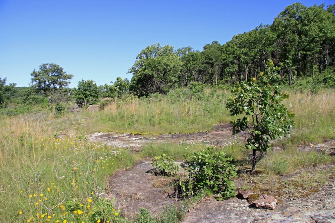 Lichen Glade Natural Area is a small area owned by The Nature Conservancy that boasts a high-quality sandstone glade surrounded by post oak/black jack oak forest. My first visit to the area more than 20 years ago was during May, and it was one of the most productive collecting trips I’ve had with a number of Agrilus spp. (including A. frosti) beaten from post oak (Quercus stellata) along the woodland edge. I didn’t visit again until fall of 2002, when Chris Brown, Rich Thoma and I found claybank tiger beetles (Cicindela limbalis) sunning on the exposed sandstone outcrops, and I made one more visit the following May to beat more insects off of post oak. The Lichen Glade that I returned to this past weekend was a very different place from when I last visited – the surrounding woodlands had been extensively opened (I would guess within the past few years based on the size of the post oak resprouts), and fire had been used throughout the area. Anticipation turned to frustration when no amount of beating of the woodland vegetation and sweeping of the glade vegetation turned up beetles in any appreciable numbers (or any insects for that matter) and two hours worth of effort yielded not a single buprestid beetle!