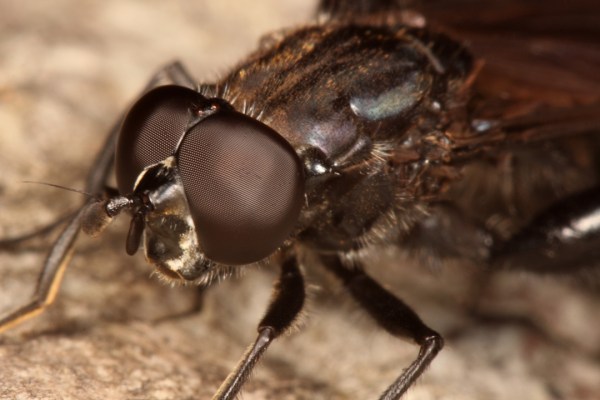 According to BugGuide, E. taeniops is a recent import to the U.S. from Africa, and in fact it has apparently successfully invaded much of the world. I suppose most folks will be inclined to forgive the fly for all this because of its strikingly patterned eyes, which I would have dearly loved to have gotten in tight for a closeup. This shot with the 100mm lens dialed in to the max (and only slightly cropped for composition), however, was the only one I managed – the fly bolted as I quickly tried to switch to the 65mm lens, and although I saw two more individuals afterwards, I couldn’t get anywhere close to them in the day’s heat. Eyes notwithstanding, the species is a near perfect mimic of a honey bee, making one wonder what selective pressures drove the development of these fantastically contrasting eyes.