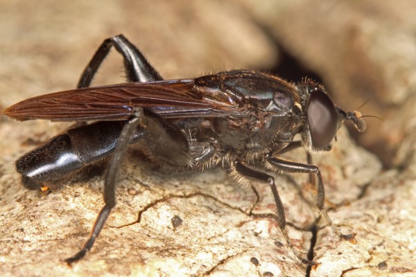 Lateral view showing black abdomen with no trace of red (except what appears to be a parasitic mite).