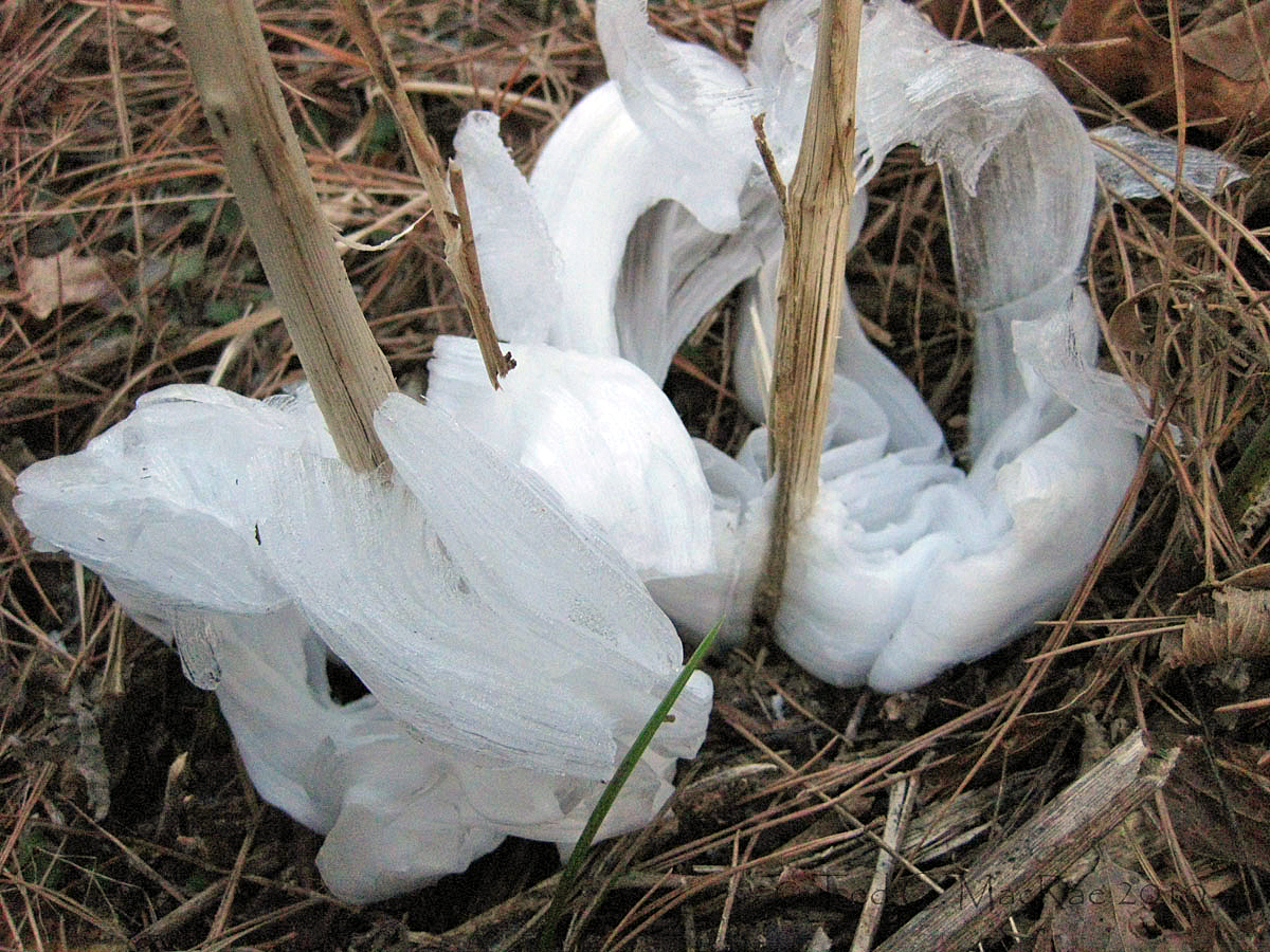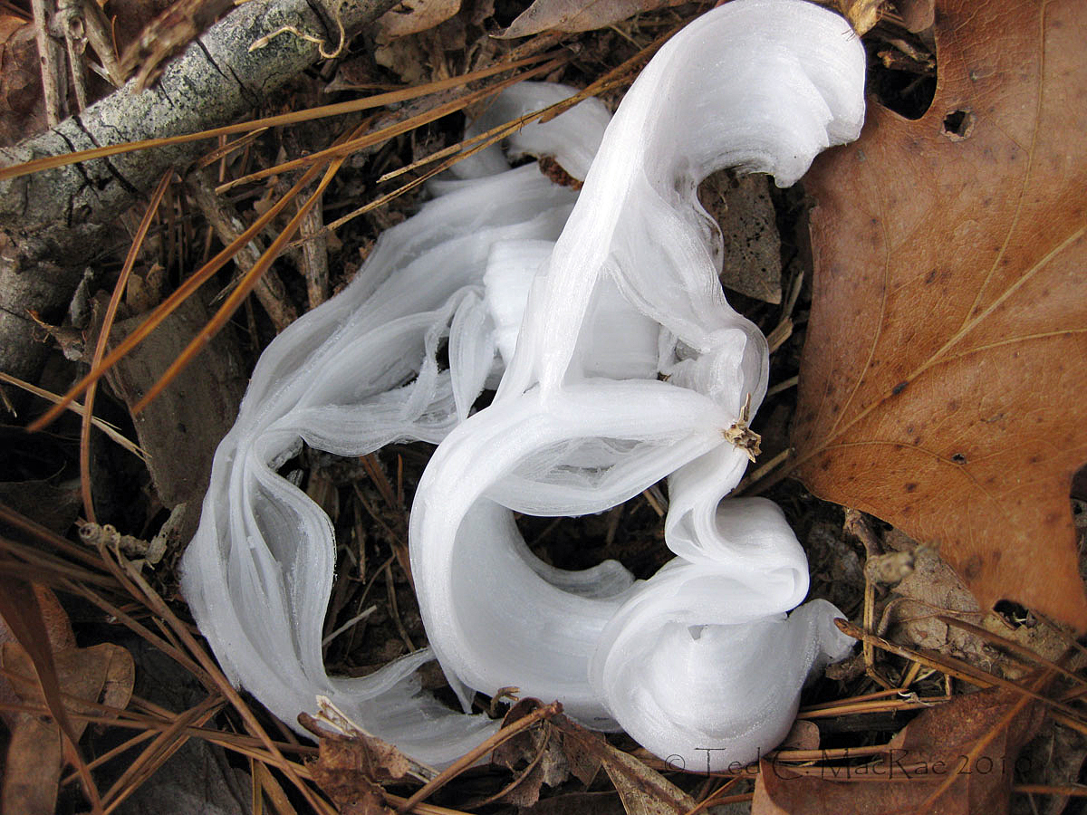Crystallofolia forms when water drawn from the soil by certain plants oozes out of the stem and contacts frigid air. Additional water pushes out the ice, then freezes itself, resulting in long, thin ribbons of ice that curl around themselves