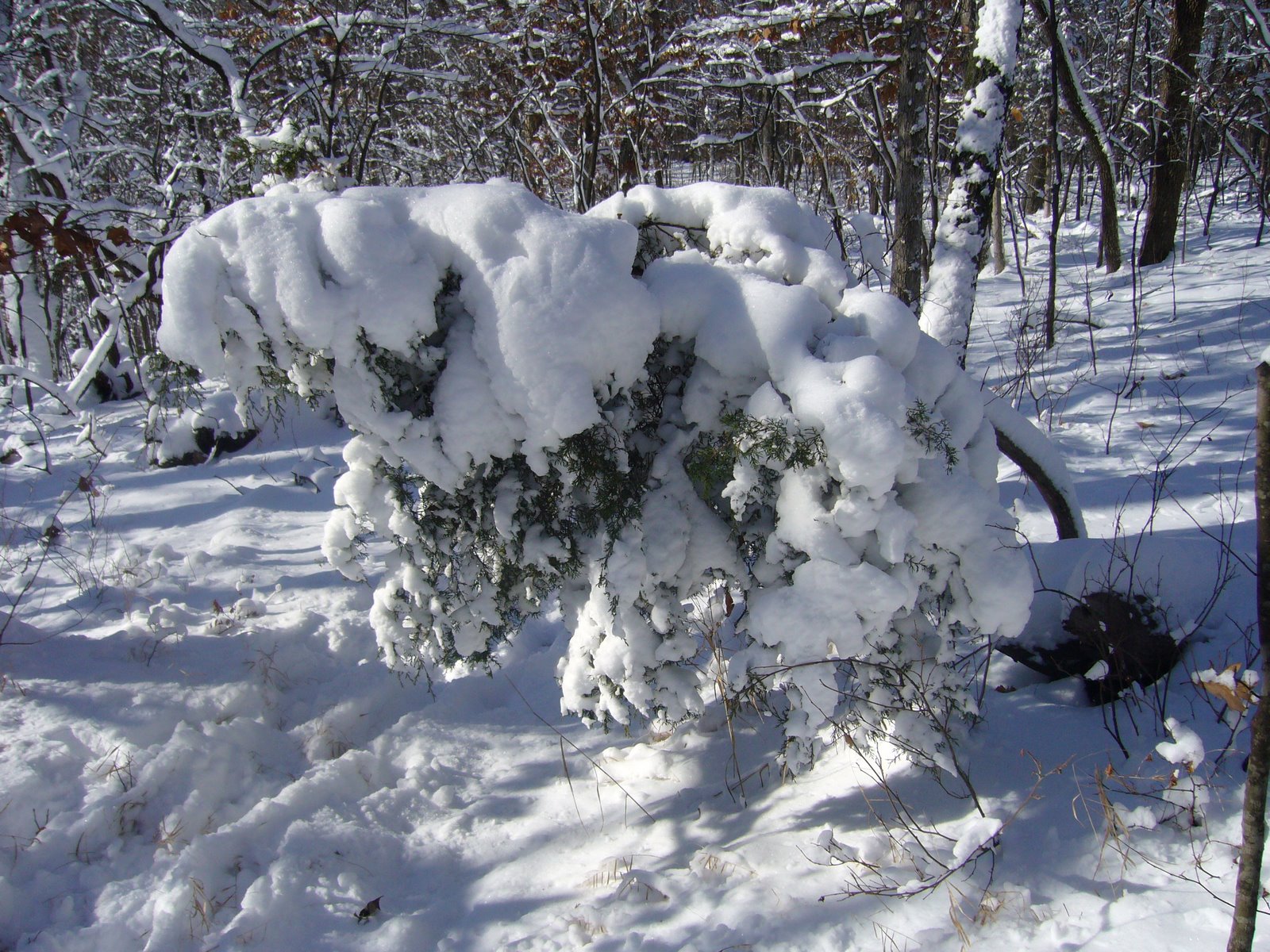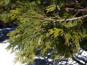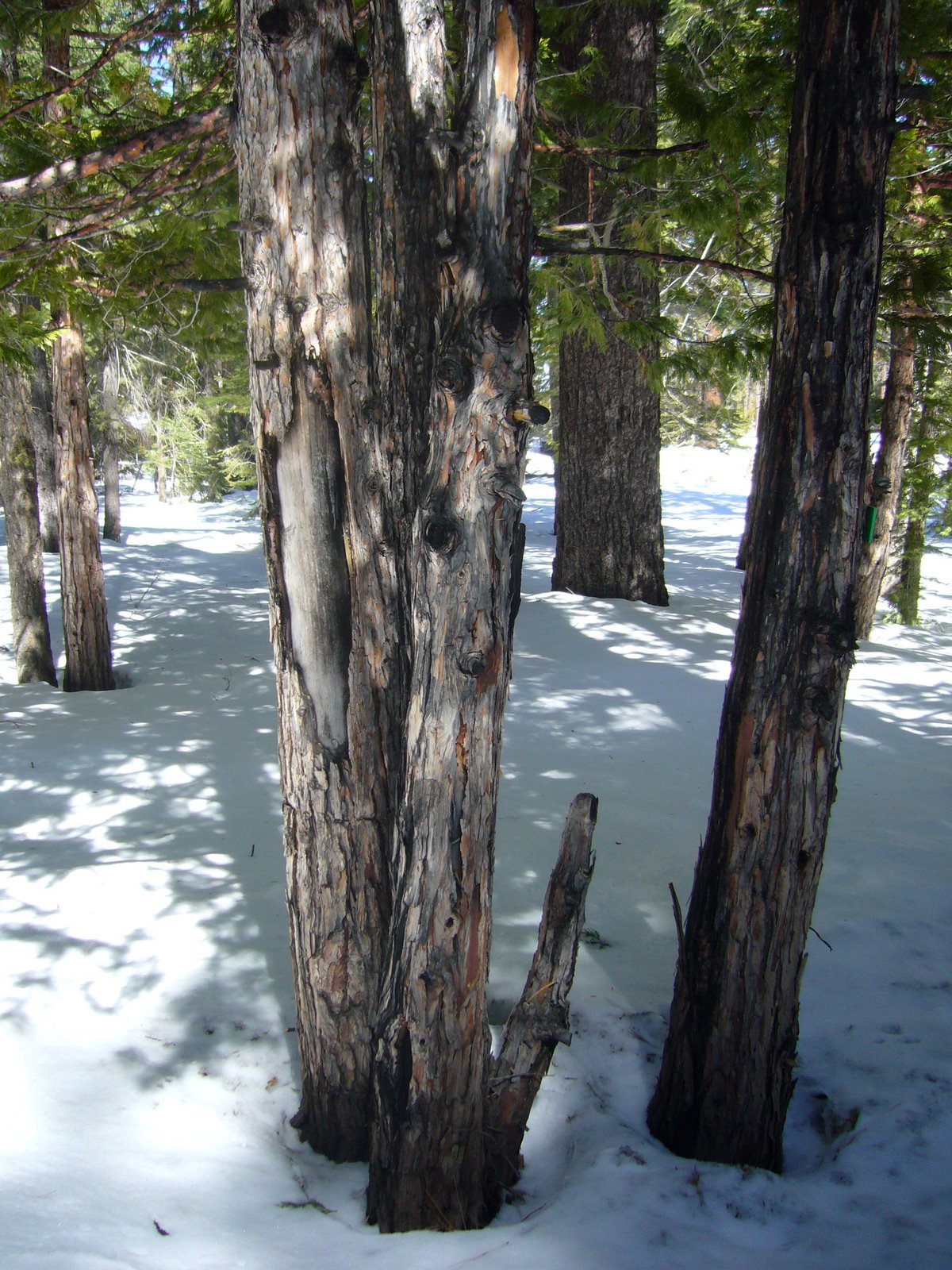 In the meantime, there would be plenty of activities to keep ourselves occupied. With the amount of snow on the ground, one might think there would be little opportunity for botanizing. However, I favor the woody flora, and I was excited about the chance to begin reacquainting myself with some of the western conifers for a change. Of these, one of my favorites is incense-cedar (Calocedrus decurrens) — mature trees develop thick, deeply furrowed, brick red bark that stands out in beautiful contrast from the other trees. Even dead trees maintain a rustic and majestic beauty, and this large dead snag is as stately as any I’ve seen: